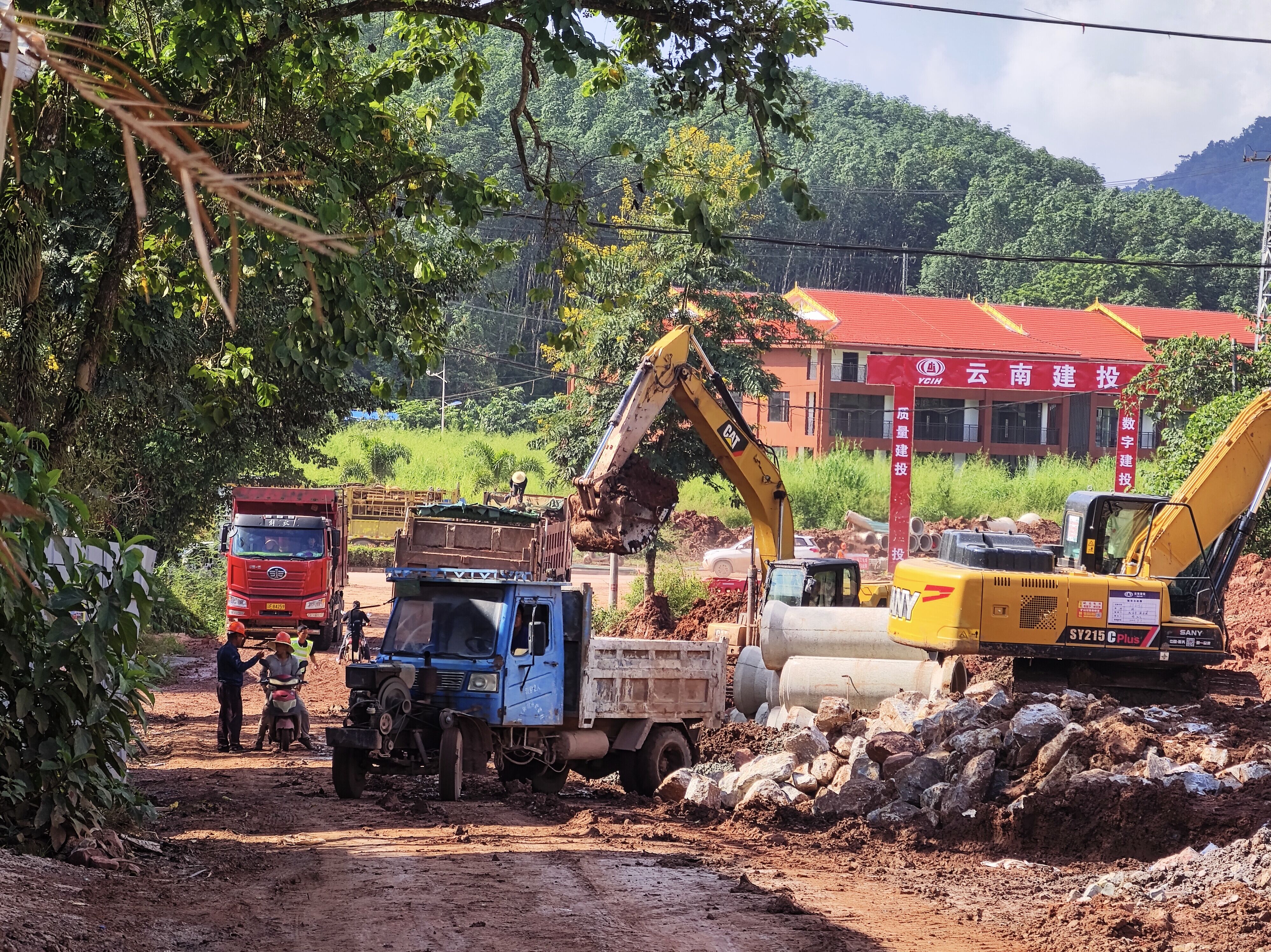 中老鐵路磨憨站志邊民互市區連接線項目A段施工現場延續著平日里的熱鬧景象,現場機器轟鳴,路基回填、基槽強夯、橋梁基礎開挖,改河繁忙,建設者們頂著烈日有條不紊地進行開挖、澆筑、強夯等施工作業,以滿腔的熱情全力推動項目建設提速增效。國慶節期間完成排水、電力檢查井澆筑50余個,安裝管道900余米,項目始終從“保安全、促質量、搶工期”出發,確??焖俑咝瓿筛麟A段施工任務。