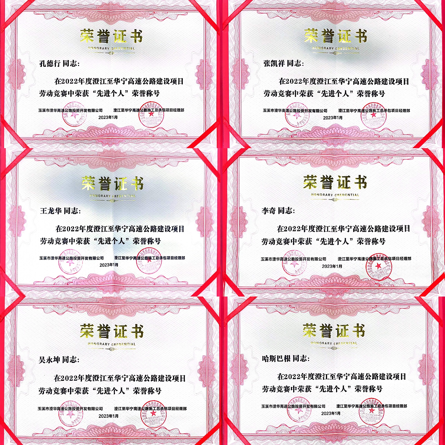 近日,由公司第五直管項目部承建的澄華高速土建九、十分部項目在云南省澄江至華寧高速公路項目“能通全通”“互聯(lián)互通”工程勞動競賽中榮獲“先進(jìn)集體”榮譽稱號,項目管理人員“孔德行、李奇、張凱祥、哈斯巴根、吳永坤、王龍華”6人榮獲“先進(jìn)個人”稱號。