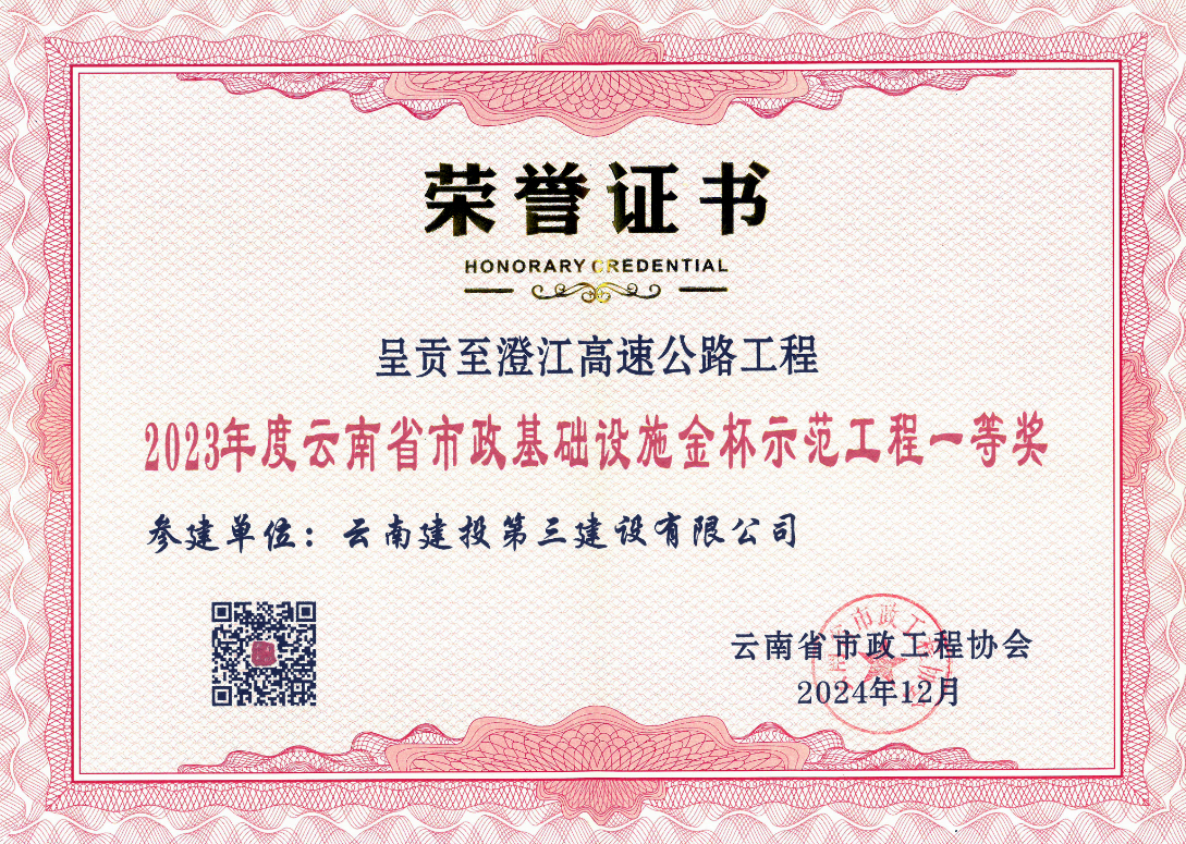 近日,云南省市政工程協會七屆三次會員大會暨云南省市政行業高質量發展論壇在昆明召開,由路橋市政直管一部承建的呈貢至澄江高速公路工程項目榮獲2023年度云南省市政基礎設施金杯示范工程一等獎。