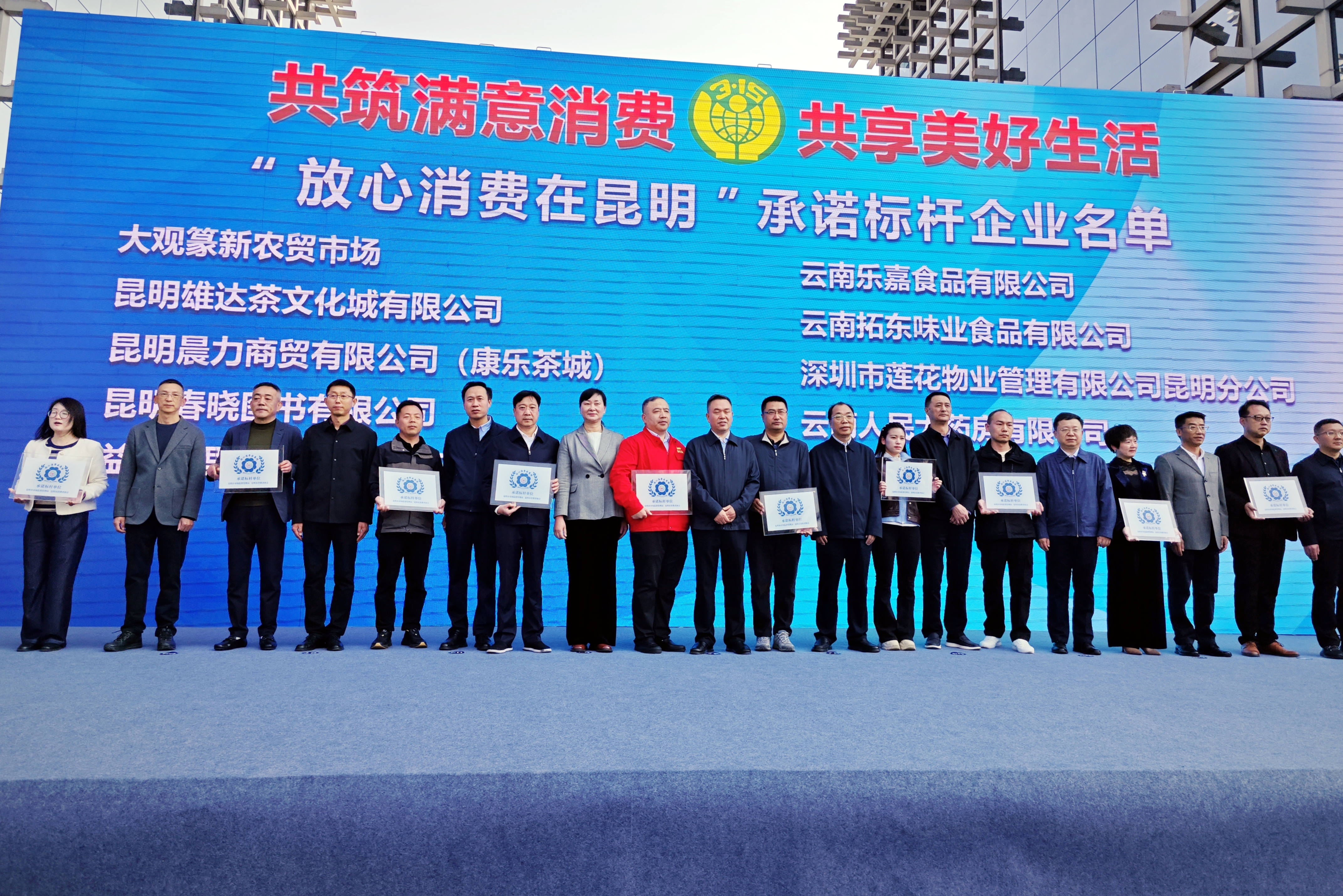 3月15日上午,2025年云南省“3.15”國際消費者權益日“宣傳活動”暨“放心消費在昆明”行動啟動儀式在昆明市1903公園隆重舉行,現場對十家放心消費承諾標桿單位和十家優秀維權站點進行授牌,其中,公司所屬大觀篆新農貿市場獲昆明市3.15“放心消費在昆明”承諾標桿單位。