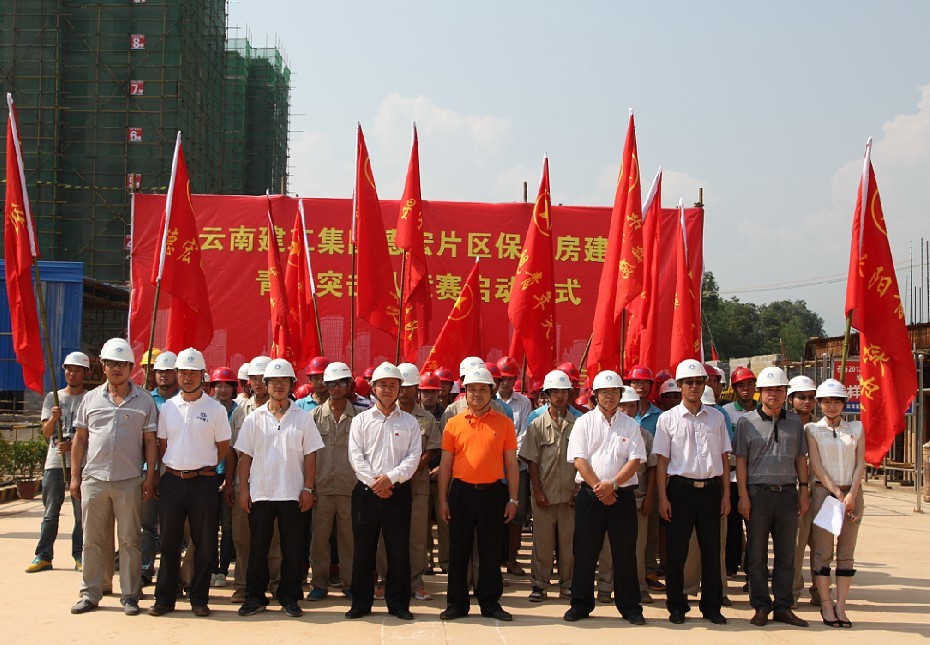 為確保“兩個轉(zhuǎn)移”落地生根,全面完成好2013年保障性住房建設(shè),公司作為保障房德宏片區(qū)青年突擊隊建功競賽活動的責(zé)任單位,在該片區(qū)各項目點成立青年突擊隊,開展以比安全、比質(zhì)量、比進(jìn)度、比形象為主要內(nèi)容的競賽活動。5月23日,公司團(tuán)委在德宏保障性住房四A地塊舉行德宏片區(qū)保障房青年突擊隊競賽啟動儀式,共青團(tuán)德宏州州委副書記李二喊過,集團(tuán)團(tuán)委副書記雷棲,集團(tuán)指揮部副指揮長董義國,鄉(xiāng)投公司德宏分公司經(jīng)理楊照,鄉(xiāng)投公司德宏分公司書記、副經(jīng)理朱紅喜,鄉(xiāng)投公司德宏分公司總工程師王長錄等出席儀式,儀式由公司團(tuán)委書記丁溪主持,九家施工單位12支青年突擊隊150余人參加啟動儀式。