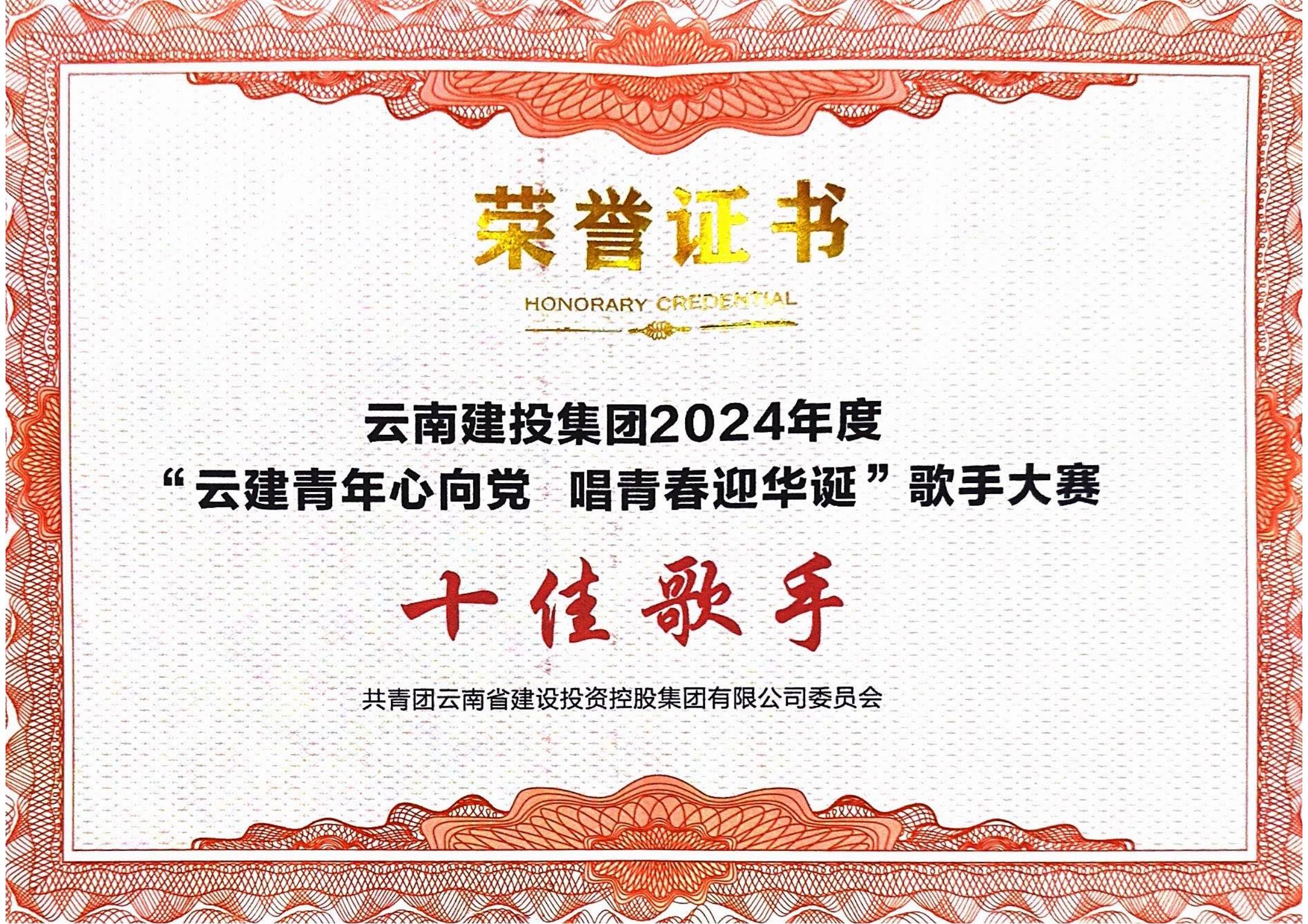 9月29日,公司參賽選手唐鵬杰在集團“云建青年心向黨 唱響青春迎華誕”歌手大賽中榮獲第二名,獲“十佳歌手”稱號。